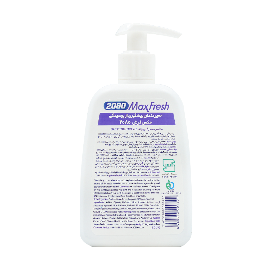 خمیر دندان ضد پوسیدگی مکس فرش 2080 یک انتخاب مطمئن برای مراقبت روزانه از دندانها است که توسط شرکت معتبر بهداشت سلامت آریا اندیشان تولید شده است. این محصول با بسته بندی پمپ دار پلاستیکی و بسیار کاربردی، استفاده راحت و بهداشتی را فراهم میکند و از هدر رفتن خمیر جلوگیری مینماید. از طرفی دیگر فرمولاسیون آن به گونهای طراحی شده که ضمن تمیز کردن عمقی دندانها، از آسیب مینا جلوگیری کرده و دهان را برای مدت طولانی تازه و خوشبو نگه میدارد. البته به خاطر داشته باشید اگر در روتین بهداشت دهان خود، خرید دهانشویه و استفاده از آن را نیز اضافه کنید، اثر این خمیر دندان دو چندان خواهد شد.