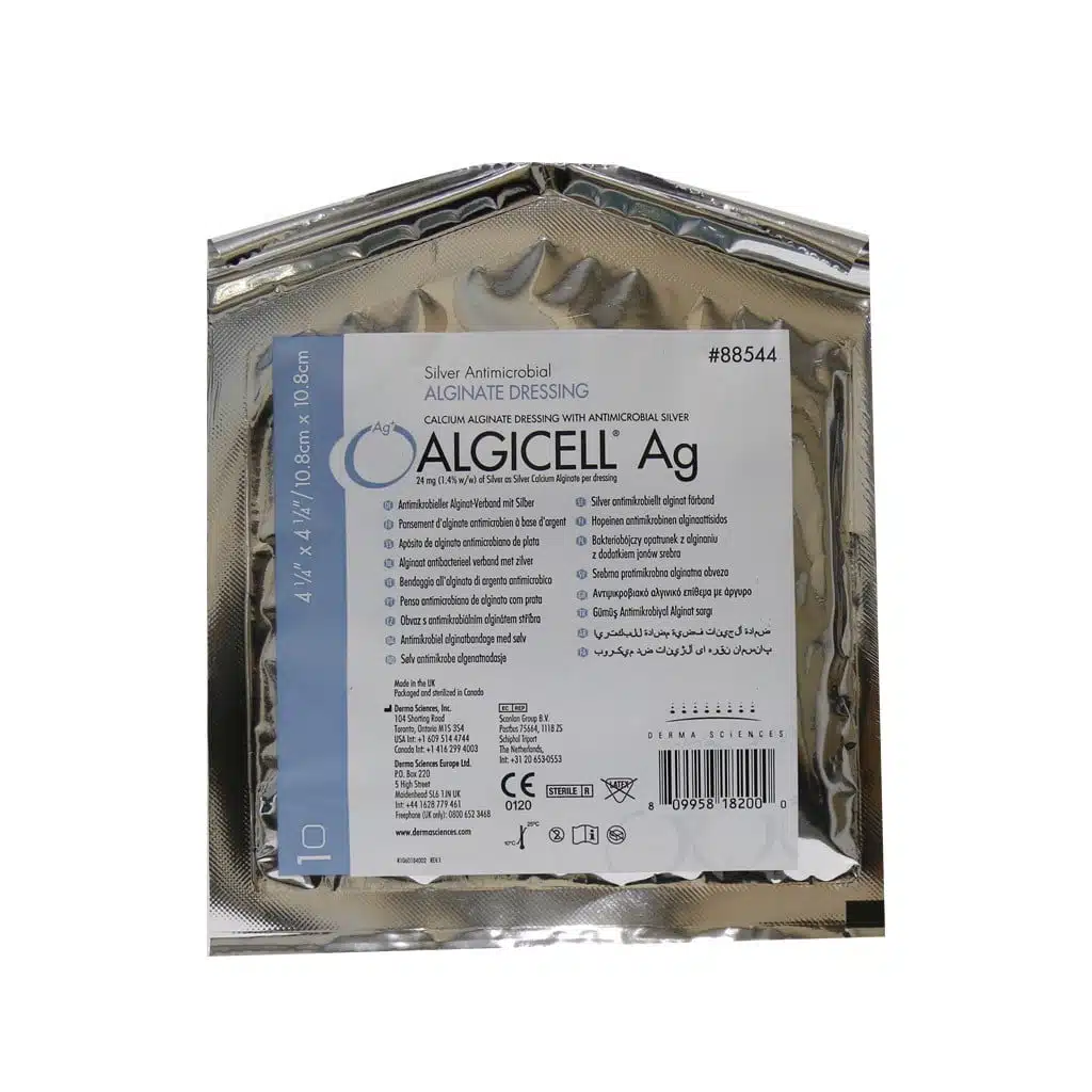 پانسمان آلژینات نقره دار Dermascience آل جی سل یک پانسمان اولیه جذب شونده متشکل از کلسیم آلژینات و شامل 1.4 % نقره است. ماده ترشح اولیه یونهای سدیم این پانسمان از یون های نقره آزاد گرفته شده است. این پانسمان با خاصیت جذب شوندگی بالا همانند ژل به عنوان یک کمک کننده اصلی در حفظ و ایجاد یک محیط مرطوب برای بهبود زخم به کار گرفته شده است.جدا نمودن آن به سادگی و بدون هر گونه آسیب انجام میگیرد. لایه مایع پوشش یون های نقرهای از تجمع باکتریها محافظت کرده و یک سد محافظ برای جلوگیری از نفوذ باکتری ها ایجاد می کند. تاثیر آنتی باکتریال این پانسمان توسط شرکت Kirby-Bauer نشان داده شده و تست حساسیت آن توسط ASTM E2149-01 بررسی شده است. این پانسمان تحت نظارت مراقبتهای بهداشتی حرفهای شرکت ALGICELL است، که یک مانع مؤثر در برابر نفوذ باکتریها بوده و برای بهبود زخمهای سطحی و عمیق همانند مواردی چون زخمهای دیابتی پا، انواع زخمهای پا (زخمهای وریدی، زخمهای شریانی و زخمهای ترکیبی اتویولوژی)، زخمهای فشاری، زخمهای سطحی و عمیق و محل دهنده پیوند و زخمهای ناشی از جراحی استفاده میشود.ویژگی های پانسمان آلژینات نقره دار Dermascience آل جی سل