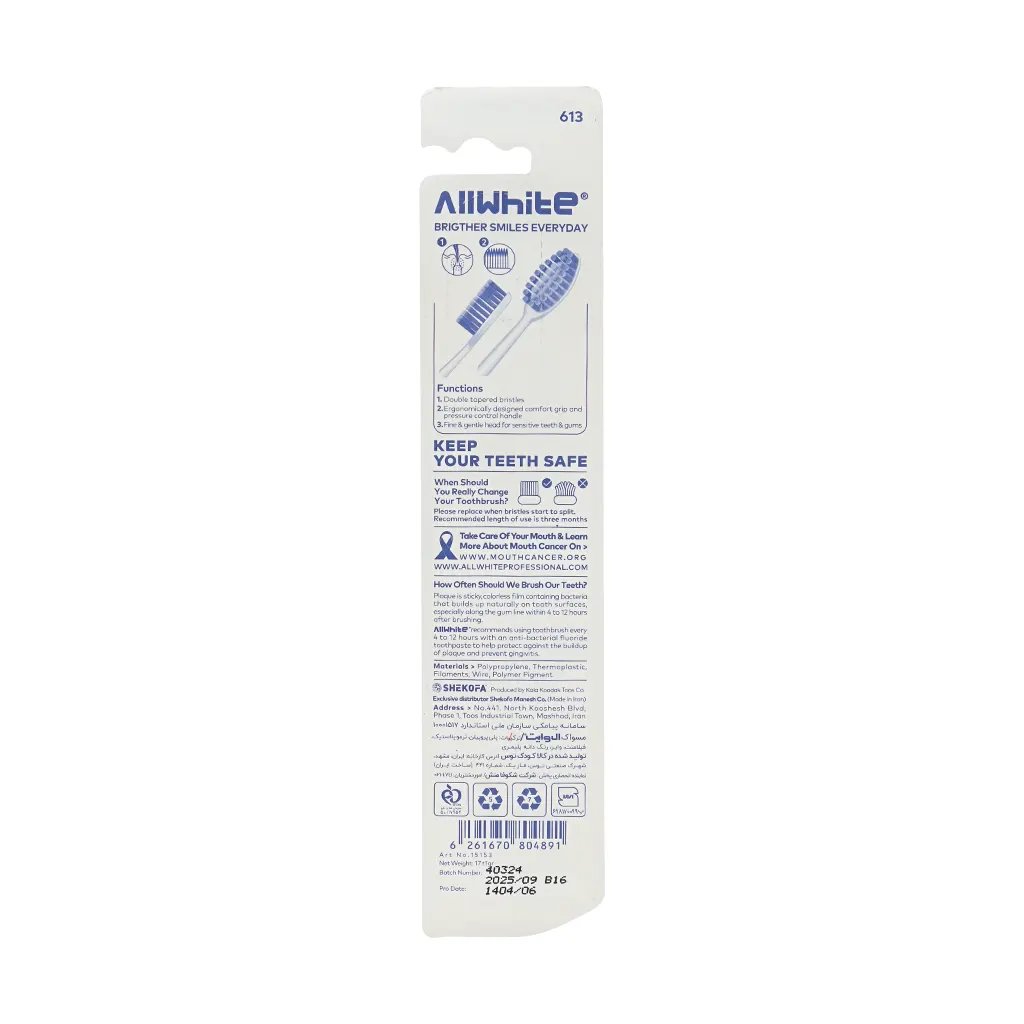 - مسواک آل وایت کد 613 دارای پرزهای متوسط و سر گرد جهت پاکسازی موثر پلاک و باکتریها از سطوح دندانها