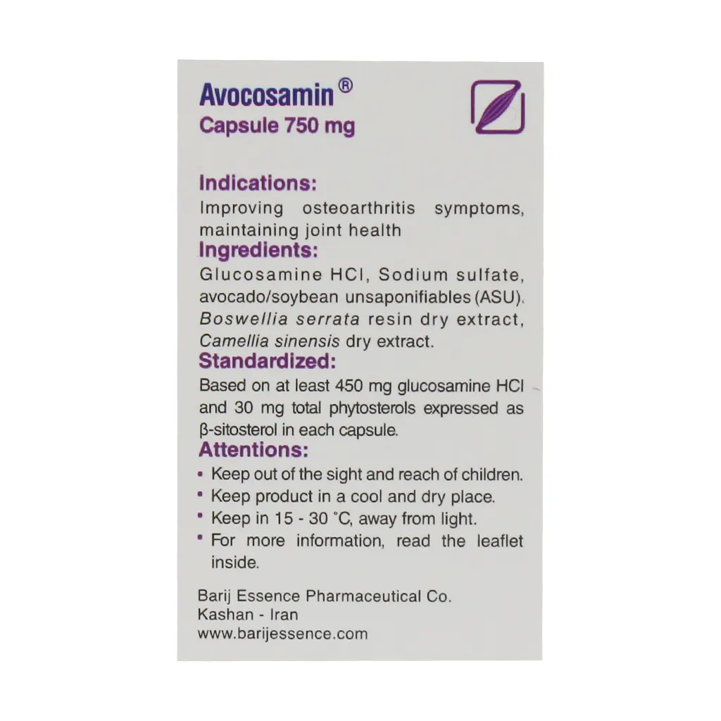 کپسول آووکوزامین باریج اسانس یک مکمل گیاهی و طبیعی است که توسط شرکت داروسازی باریج اسانس تولید شده و به طور اختصاصی برای سلامت مفاصل، کاهش دردهای آرتروز و بهبود عملکرد حرکتی طراحی شده است. این محصول با بهره گیری از عصارههای گیاهی مانند سویا و آووکادو، چای سبز و عصاره خشک صمغ کندر، ترکیبی ایمن و موثر برای حمایت از سلامت مفاصل و غضروفها محسوب میشود.