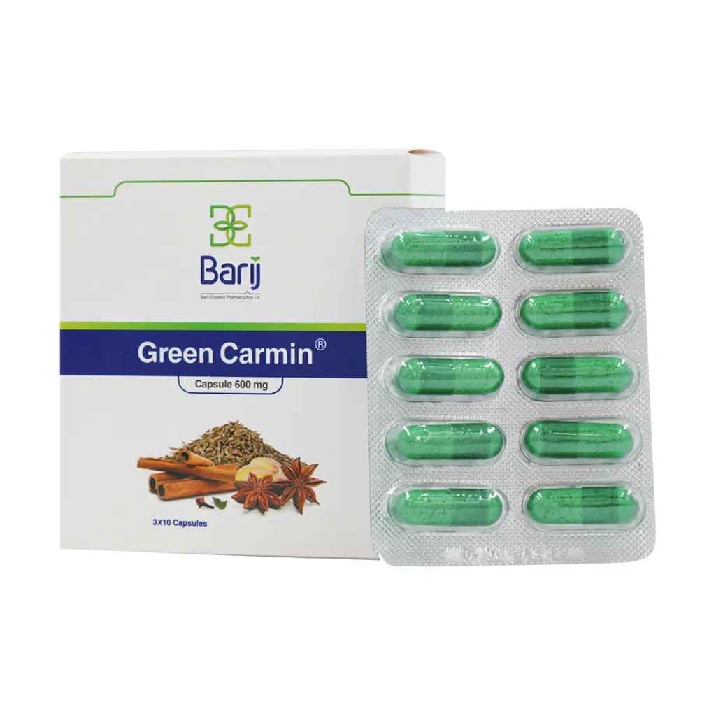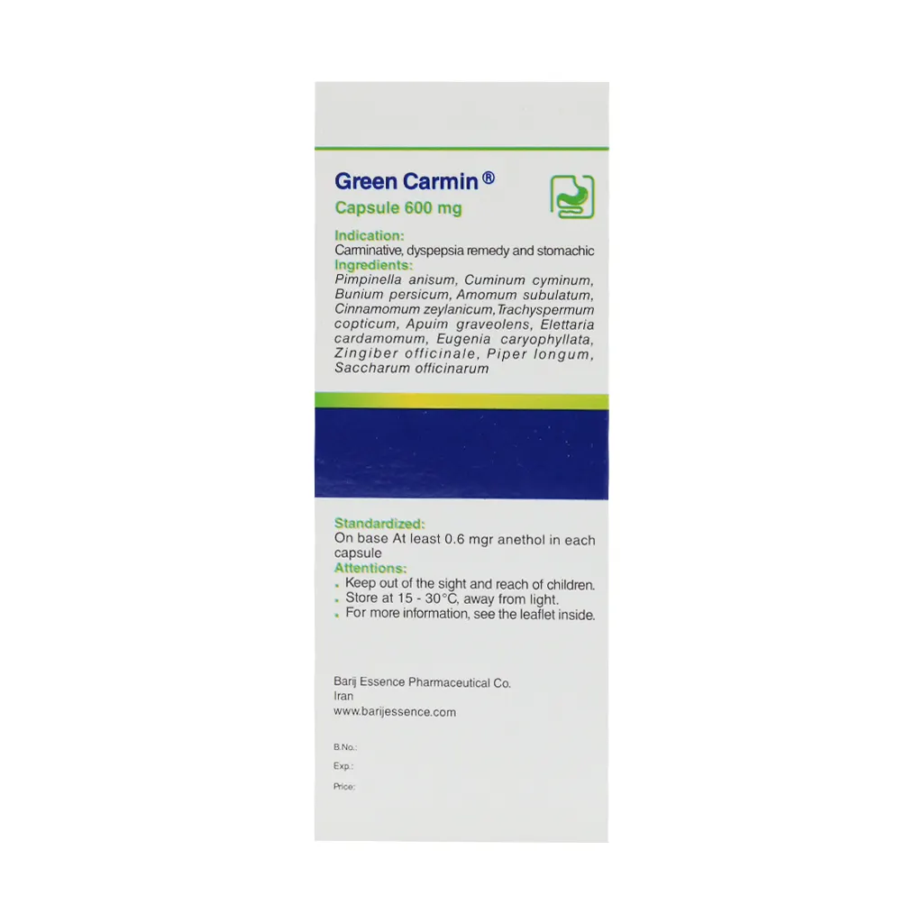 کپسول گرین کارمین باریج اسانس به علت داشتن ترکیبات اسانسی همچون کیومین آلدئید و آنتول قابلیت جذب سریع در دستگاه گوارش را دارد. این فراورده میتواند سبب کاهش کشش سطحی حبابهای کوچک و تولید حبابهای بزرگ شده و دفع گاز از لوله گوارش را آسان کند. از سوی دیگر اجزا این دارو گیاهی آثار خود را در رفع سو هاضمه که اکثرا ناشی از مشکل هضم غذا است نشان میدهد. لازم به ذکر است سو هاضمه به اشکال مختلف مانند نفخ ، یبوست، اسهال، دل درد، ترش کردن معده و مشکل هضم شدن غذا بروز پیدا میکند.
