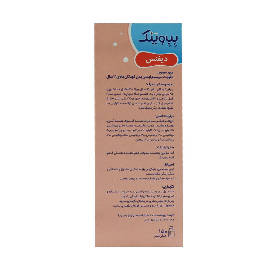 شربت بب وینک دیفنس با بالا بردن تعداد گلبولهای سفید خون تاثیر مثبتی بر سیستم ایمنی دارد و با عفونت مبارزه مینماید. همچنین از طریق بالا بردن سیستم ایمنی به مبارزه بدن علیه بیماریها کمک نموده و سبب بهبود عملکرد روده نیز میشود. این فراورده حاوی پری بیوتیک است که نوعی فیبر غذایی به شمار آمده و باکتریهای روده را تغذیه میکند و به باکتریهای روده اجازه میدهد تا مواد مغذی برای سلولهای روده بزرگ تولید کنند و منجر به سلامت سیستم گوارشی و تقویت سیستم ایمنی میشود. علاوه بر آن از آنجایی که کمبود زینک میتواند منجر به تضعیف پاسخ ایمنی بدن شود، به کار بردن زینک در کنار ویتامینهای گروه ب باعث ارتقا قابل توجه سیستم ایمنی میشود و از ابتلای کودکان به بیماری پیشگیری مینماید.