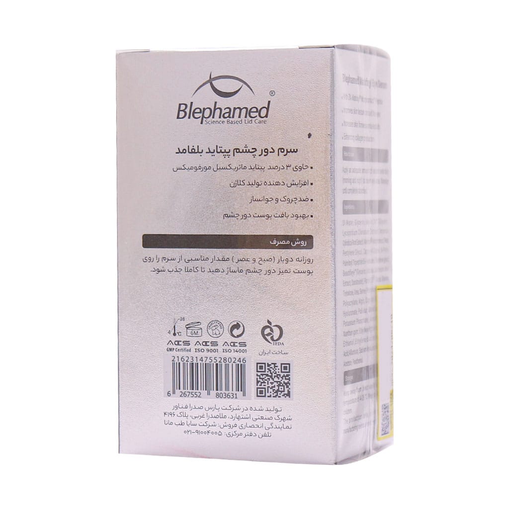 سرم دور چشم پپتاید بلفامد حاوی 3 درصد پپتاید ماتریکسیل مورفومیکس بوده که با هدف کاهش علائم پیری و بهبود ظاهر ناحیه دور چشم طراحی شده است. پپتایدها با تحریک تولید کلاژن به کاهش چین و چروک و خطوط ریز کمک میکنند که باعث جوانتر و صافتر شدن پوست دور چشم میشود و به تقویت ساختار پوست و افزایش انعطاف پذیری آن کمک میکند. این سرم حاوی ترکیبات آبرسان است که به حفظ رطوبت پوست و جلوگیری از خشکی آن کمک میکند. سرم دور چشم پپتاید بلفامد از مواد اولیه وارداتی از کمپانیهای اروپایی فرموله و تولید شده است؛ از این رو اثرگذاری چشم گیری دارد و بعد از مدتی استفاده منظم، شاهد تغییرات چشمگیر در ناحیه دور چشم خواهید شد.