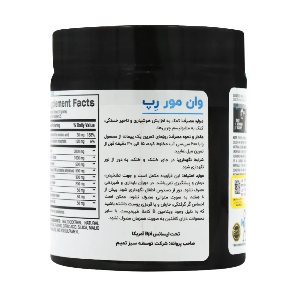 پودر وان مور رپ بی پی آی اسپورت از جمله مکملهای فوق العاده جهت افزایش انرژی و بهبود عملکرد ورزشی ورزشکاران است. اولین ترکیب وان مور رپ بی پی آی، ویتامین B3 یا نیاسین است که تاثیر بسزایی در سنتز پروتئینها، کربوهیدرات و چربی دارد. ترکیب اصلی پمپ وان مور رپ بی پی ای آمینواسیدی به نام ال سیترولین است.