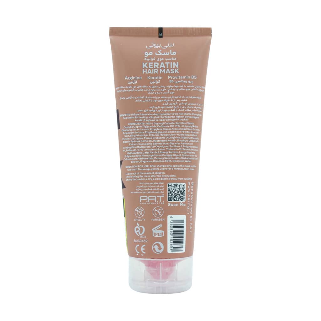 - کراتین موجود در این ماسک به تقویت ساختار مو و ترمیم آسیبهای ناشی از رنگ، دکلره، حرارت و عوامل محیطی کمک میکند.