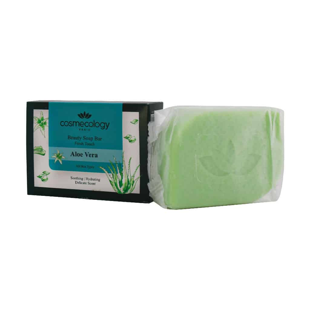 صابون آلوئه ورا کاسمکولوژی مناسب انواع پوست حتی پوست‌های حساس است. این محصول حاوی اسید چرب سویا، عصاره آلوئه ورا، وازلین و موم زنبور عسل بوده و پوست را مرطوب و نرم می‌کند. موم زنبور عسل موجود در این محصول مانع از تبخیر آب موجود در بافت پوست شده و از خشکی پوست جلوگیری می‌کند. این ماده پوست آسیب‌دیده را ترمیم می‌کند، التهابات را تسکین بخشیده و مانع از بروز جوش و آکنه می‌شود. صابون آلوئه ورا کاسمکولوژی به سبب ترکیبات موثر خود، خارش پوست را درمان کرده و التهابات را از بین می‌برد. خرید صابون کاسمکولوژی کمک شایانی به کاهش علائم اگزما، درماتیت و پسوریازیس کرده و موجب بهبود بافت پوست می‌شود.