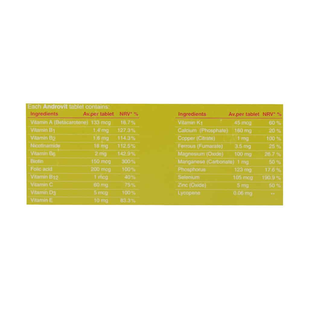 این قرص با ترکیبات منحصر به فردی که دارد به یک مولتی ویتامین و مینرال ویژه مردان تبدیل شده است. مکمل آندروویت مجموعه کاملی از آنتی اکسیدانها و تحت لیسانس شرکت کیوفارما اسپانیا به سلامت عمومی بدن، تقویت قوای جنسی و بهبود نعوظ و افزایش انرژی آقایان کمک میکند. این محصول از داروخانه آنلاین مثبت سبز از ترکیبات موثری تشکیل شده است که در ادامه به فواید هر یک برای آقایان میپردازیم: