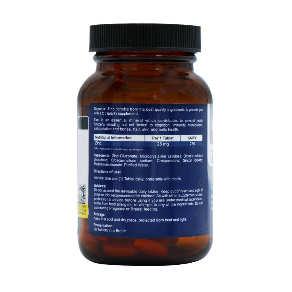قرص زینک 25 میلی گرم دایونیکس به تامین زینک مورد نیاز بدن پرداخته و از کمبود آن جلوگیری میکند. این محصول یک گزینه ایده آل برای تقویت سیستم ایمنی، افزایش سلامت پوست، مو و ناخن و بهبود عملکرد بدن است. همچنین قادر است به تسریع روند بهبود زخمها کمک نماید. این محصول تحت لیسانس دایونیکس فارما کشور انگلستان، دارنده پروانه ساخت شرکت امید دارو سلامت، در شرکت داروسازی الحاوی در ایران تولید و بسته بندی شده است.