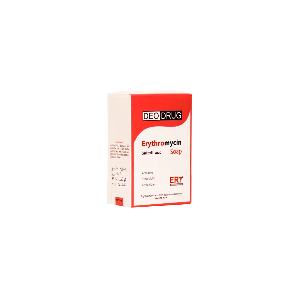 صابون اریترومایسین دئودراگ قابل استفاده در درمان انواع آکنه و تنظیم کننده چربی پوست می باشد. این محصول با لایه برداری موثر بر روی پوست و جلوگیری از فعالیت باکتری های مولد آکنه، باعث پاکسازی پوست می شود. اریترومایسین موجود در این صابون برای درمان آکنه و جوش و پیشگیری از عفونت های سطحی و چرک زدایی پوستی به کار می رود.