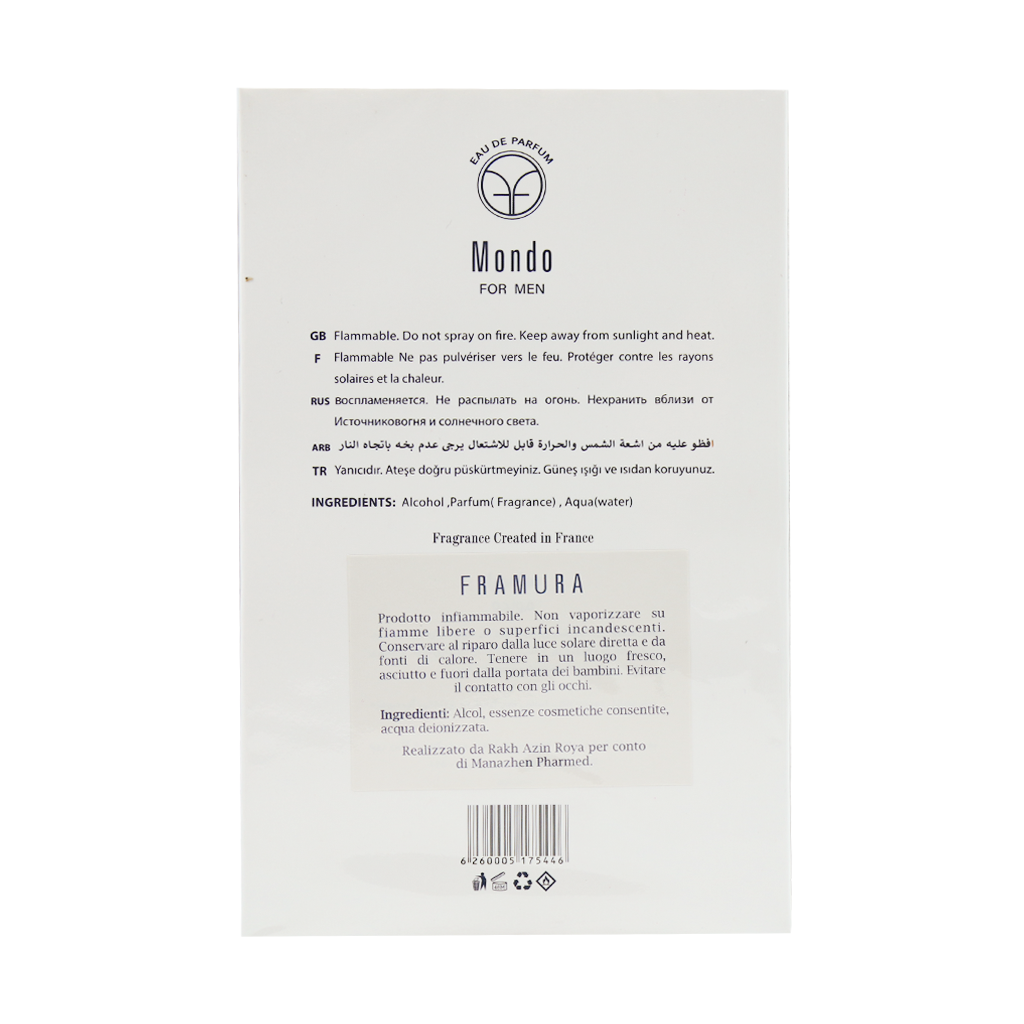 ادوپرفیوم مردانه موندو فرامورا عطری خوش ساخت و حرفهای از برند ماناژن فارمد است که تحت لیسانس فرانسه تولید شده و با شیشهای شیک و اسپری با کیفیت عرضه میشود. این عطر رایحهای مردانه، گیرا و انرژی بخش دارد و برای استفاده روزانه و حتی مهمانیها گزینهای جذاب محسوب میشود. علاوه بر آن با پخش بوی بالا و ماندگاری قابل توجه، یکی از انتخابهای مناسب برای آقایانی است که به دنبال عطری خاص و مناسب تمامی فصول هستند. ناگفته نماند اگر در کنار این عطر از اسپری ضد تعریق نیز استفاده کنید، ماندگاری و طراوت رایحه برای ساعات طولانیتری همراهتان خواهد بود.نت های ادوپرفیوم مردانه فرامورا مدل موندو