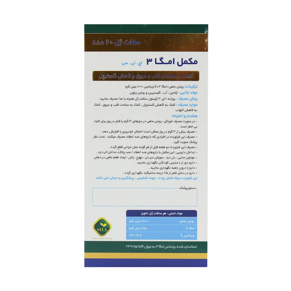 روزی 1 تا 2 عدد کپسول ژلاتینی امگا 3 اچ تی سی بعد از غذا میل شود.