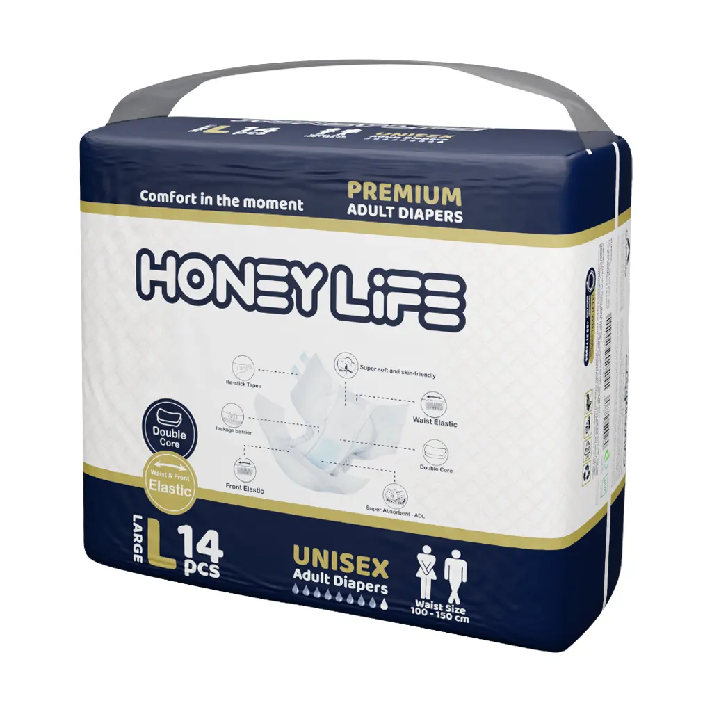 پوشک بزرگسال سایز بزرگ هانی لایف محصولی با جذب فوق العاده بالا و طراحی چند لایه است که برای افراد سالمند، بیماران بستری یا دارای بی اختیاری ادرار طراحی و در نظر گرفته شده است. این پوشک با لایه داخلی نرم، لایه بیرونی تنفسی و چسبهای قابل تنظیم، راحتی، خشکی و اطمینان را در تمام طول روز برای فرد فراهم میکند تا از نشت و بروز بوی ناخوشایند جلوگیری شود.