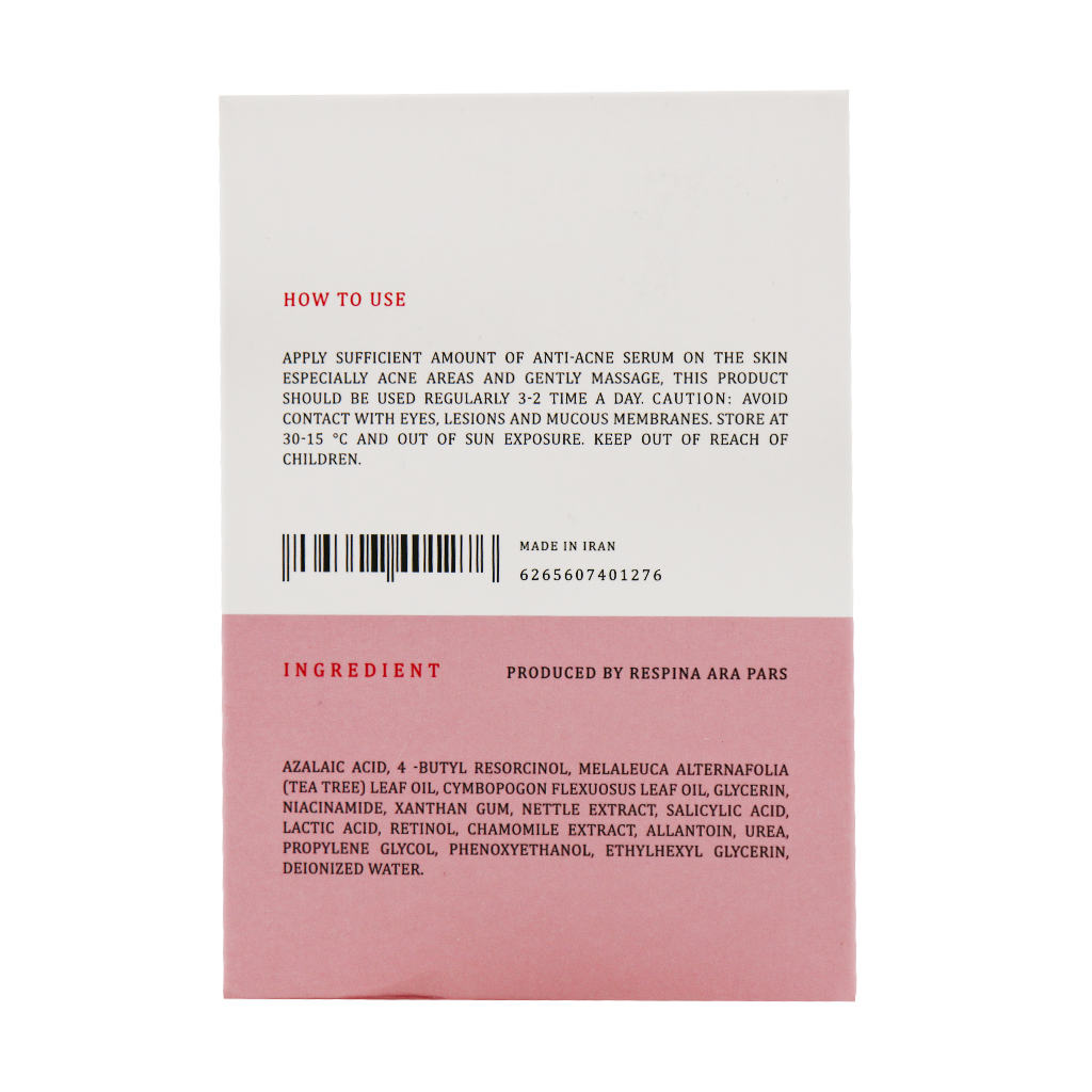 آزالئیک اسید،4-بوتیل رزورسینول، روغن درخت چای، عصاره بابا آدم، گلیسرین، نیاسین آمید، آلانتوئین، عصاره گزنه، زانتان گام، پروپیلن گلیکول، اسید سالیسیلیک، رتینول، عصاره بابونه، اسید لاکتیک، اتیل هگزیل گلیسرین، فنوکسی اتانول، اوره، آب