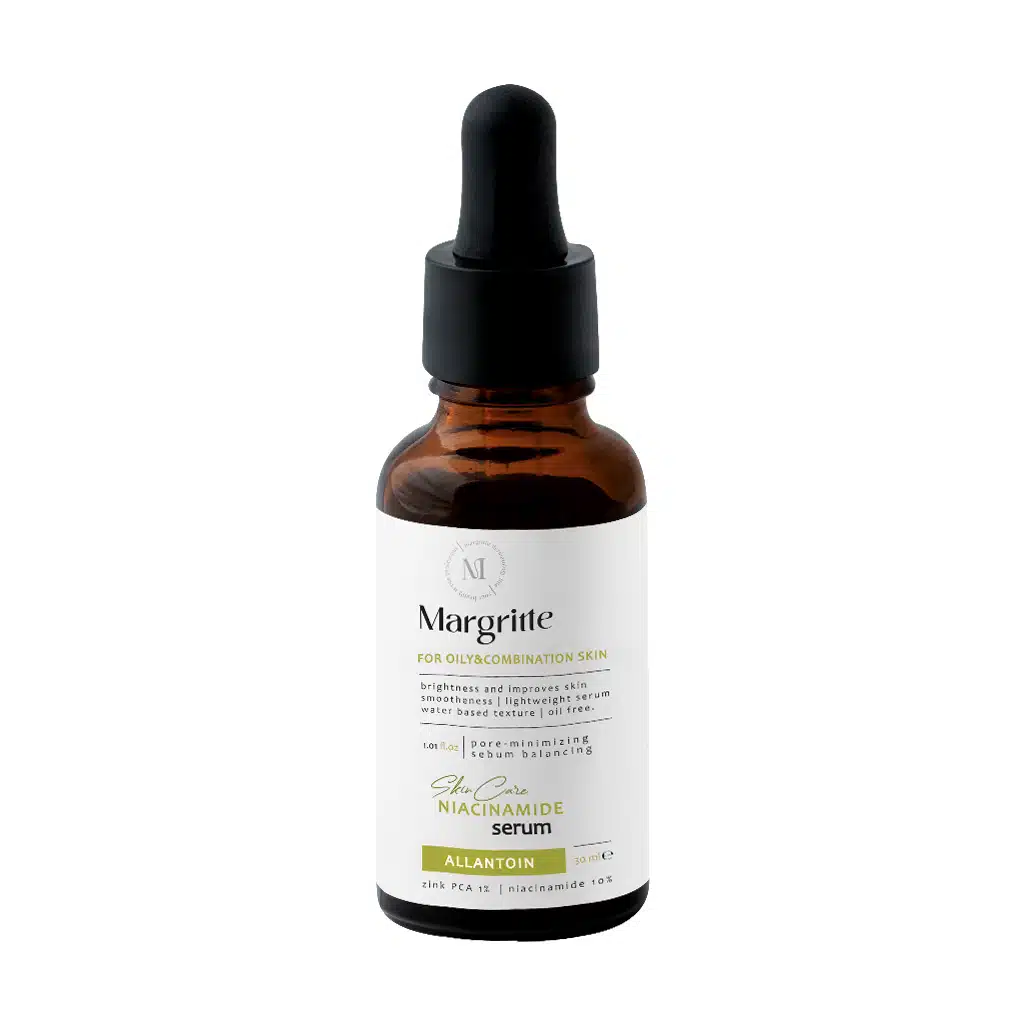 سرم نیاسینامید مارگریت حاوی ترکیبات موثری از جمله نیاسینامید و زینک بوده که یک گزینه مناسب برای افرادی است که پوست چرب و مختلطی دارند و به دنبال یک روش مناسب برای کاهش چربی، کوچک کردن منافذ و بهبود بافت پوست خود هستند. نیاسینامید موجود در این محصول به بهبود ظاهر پوست، کاهش قرمزی، کاهش منافذ باز و تنظیم تولید چربی کمک کرده و زینک نیز چربی اضافی پوست را کاهش میدهد. یکی از ترکبیات موثر موجود در این سرم، آلانتوئین بوده که باعث تسکین و ترمیم پوست شده و نرمی و لطافت را برای پوست شما به ارمغان میآورد.