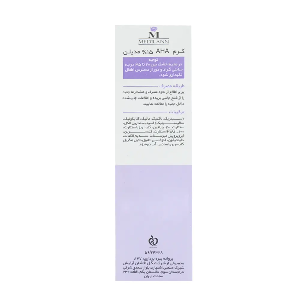 کرم لایه بردار AHA 15 درصد مدیلن حاوی آلفا هیدروکسی اسید است. این ماده به صورت کمپلکسی از چندین میوه ساختار پوست را ظریف و روشن کرده و فرآیند لایه برداری از اپیدرم، جوانسازی پوست، تحریک تولید سلولهای جدید، روشن سازی، افزایش رطوبت پوست را به دنبال دارد. آلفا هیدروکسی اسید گروهی از اسیدهای به دست آمده از گیاهانی همچون پرتقال (اسید آسکوربیک)، لیمو (اسید سیتریک)، نیشکر (اسید گلیکولیک)، انگور (اسید تارتاریک) و سیب (اسید مالیک) است که بر اساس تحقیقات انجام شده سبب افزایش پوسته ریزی طبیعی پوست و در نتیجه جداسازی لایه خارجی پوست میشود. از جمله مزایای دیگر این محصول میتوان به افزایش کلاژن سازی و کاهش چروکهای پوستی آن اشاره نمود.