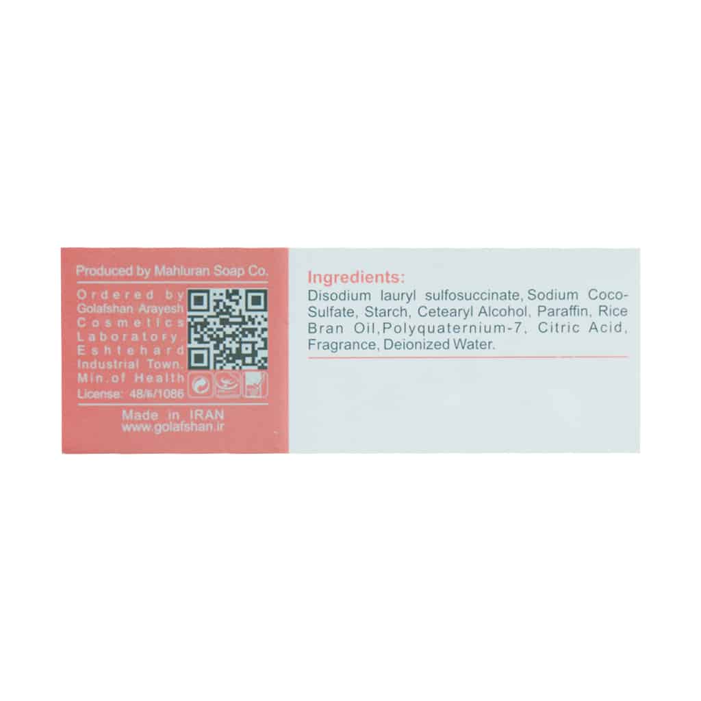 دی سدیم لوریل سولفوسوکسینات، سدیم کوکوسولفات، نشاسته گندم، ستاریل الکل، پارافین، تیتانیوم دی اکسید، روغن برنج، پلی کواترنیوم 7، سیتریک اسید، اسانس، آب دیونیزه