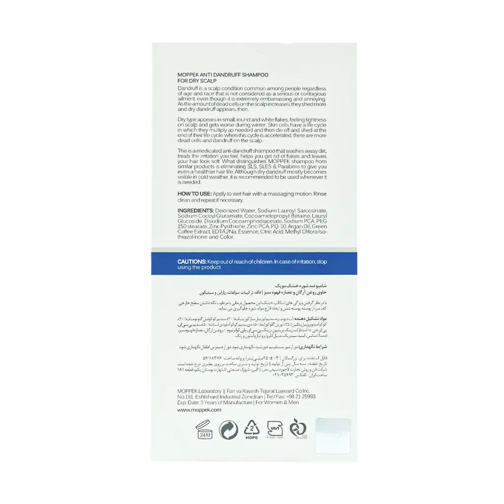 - شامپو ضد شوره خشک موپک بدون سولفات تولید شده تا ضمن شست و شوی موثر، از حفظ رطوبت طبیعی مو و پوست سر نیز مراقبت کند.
