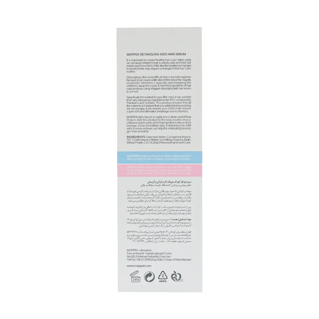 سرم دو فاز موی کودک موپک با ترکیبات آبرسان و مرطوب کننده یک راه حل مناسب برای جلوگیری از گره خوردن موها بوده که امر شانه پذیری را برای شما آسان می‌کند. همچنین با داشتن ترکیبات مفید و مغذی به تقویت موی کودکان کمک موثری می‌نماید.