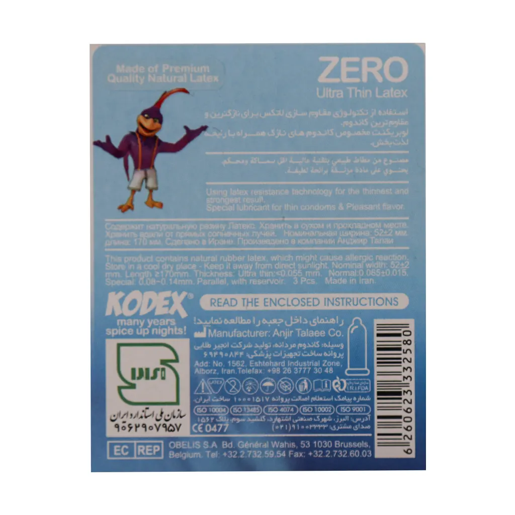 کاندوم کدکس مدل زیرو از لاتکس طبیعی و خیلی نازک ساخته شده و با داشتن ترکیبات روان کننده برای استفاده افراد خصوصا کسانی که تمایلی به استفاده از این محصولات ندارند، بسیار کارآمد است. بعلاوه حاوی ترکیبات گیاهی است که از عفونت جلوگیری میکند.