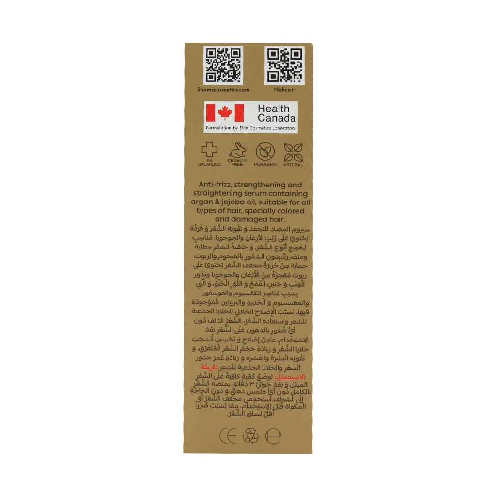 سرم ضد وز روغن آرگان ناک در بطری پمپ دار پلاستیکی 80 میلی لیتری توسط شرکت آرایشی و بهداشتی شمس تولید شده و حاوی روغنهای معجزه گر آرگان، جوجوبا، هسته انگور، جوانه گندم و بادام شیرین است. این ترکیبات به طور ویژه به تقویت، ترمیم و صاف کردن موهای آسیب دیده و رنگ شده کمک میکنند. همچنین این سرم با فرمولاسیون سبک، بدون احساس چربی یا روغن اضافی به موها نرمی و لطافت میبخشد.