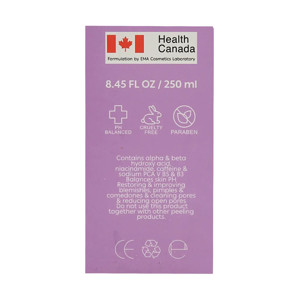 - حاوی BHA، AHA و نیاسین آمید برای لایه برداری ملایم و روشن سازی پوست