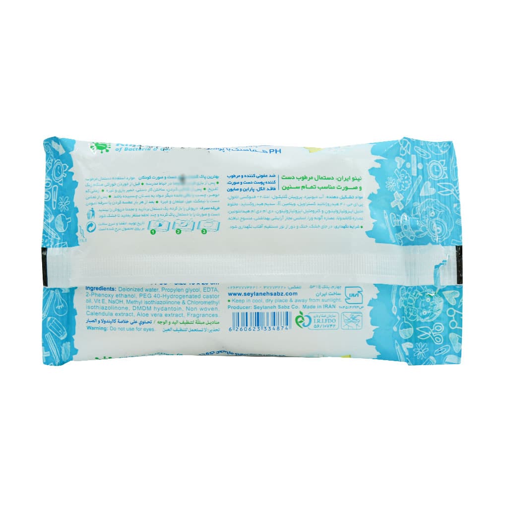 دستمال مرطوب دست و صورت نینو مدل هند فرش با بهره گیری از عصاره کالاندولا و آلوئه ورا یک گزینه مناسب جهت پاک کنندگی دست و صورت در تمام سنین است.