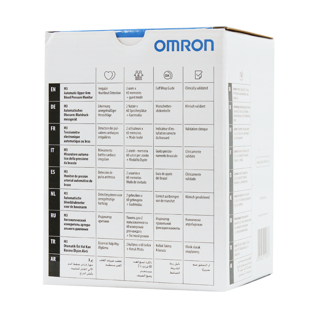 فشارسنج بازویی امرون مدلM3 با عملکرد بسیار آسان و با دقت بالا دستگاهی با صفحه نمایش بزرگ است که علاوه بر میزان فشارخون، ضربان قلب، تاریخ و ساعت را نیز نشان می دهد. این دستگاه برای ۲ کاربر به طور مجزا طراحی شده که قابلیت ضبط ۶۰ تست متوالی را برای هر یک دارد و مجموعاً دارای ۱۲۰ حافظه می باشد.