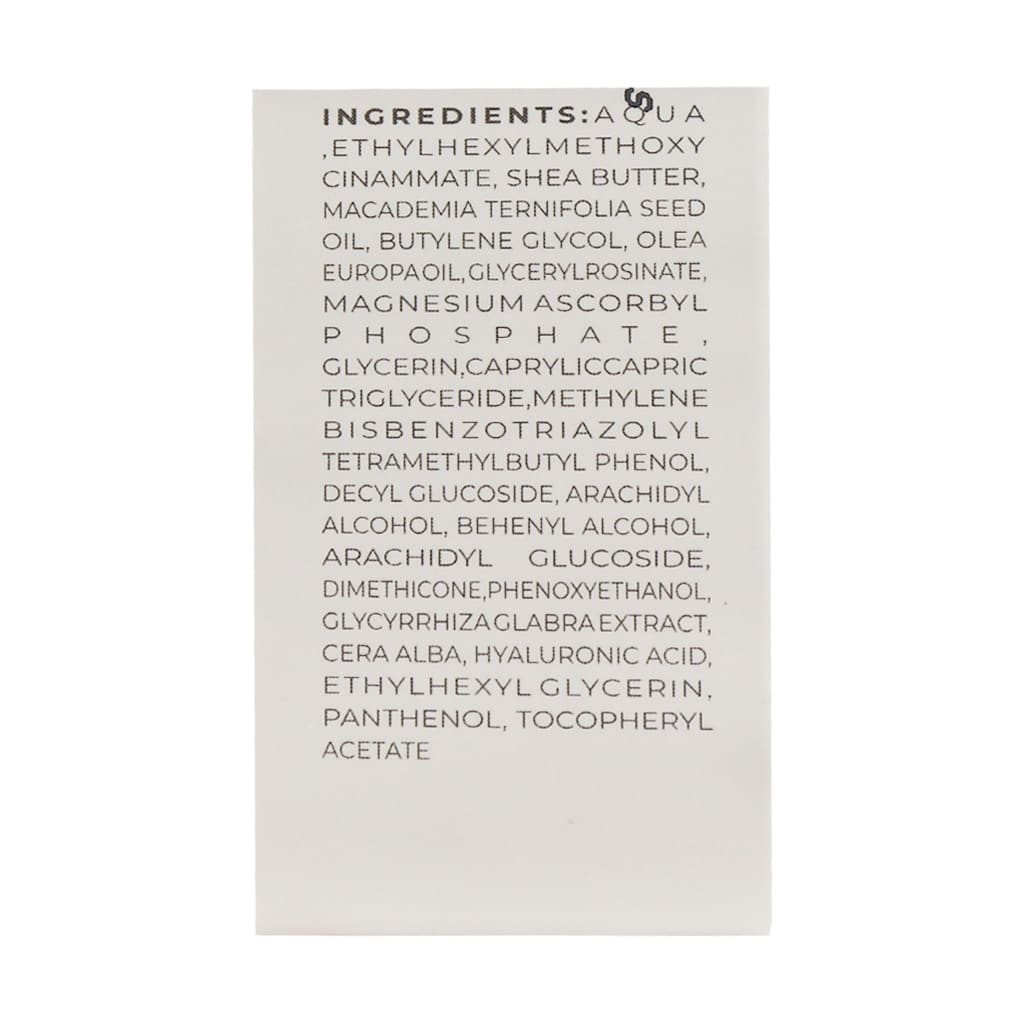 آکوا، اتیل هگزیل متوکسی سینامات، شی باتر، روغن دانه ماکادمیا، بوتیلن گلیکول، روغن اولئا یوروپا، گلیسیریل روزینات، منیزیم آسکوربیل فسفات، گلیسیرین، کاپریلیک/کاپریک تری گلیسرید، متیلن بیس بنزوتریازولیل تترا متیل بوتیل فنول، دسیل گلوکوزید، آراشیدیل الکل، بهنیل الکل، آراشیدیل گلوکوزید، دایمتیکون، فنوکسی اتانول، عصاره شیرین بیان، موم زنبور عسل، هیالورونیک اسید، اتیل هگزیل گلیسیرین، پانتنول، توکوفریل استات