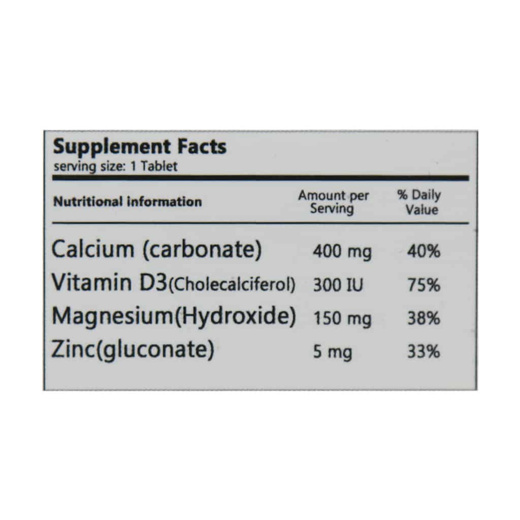 در ترکیبات این محصول کلسیم، منیزیم، زینک و ویتامین د دیده میشود که هر یک نقش مهمی در سلامت عمومی بدن بر عهده دارند. این قرص کلسیم در تقویت استخوانها، کاهش کرامپ عضلانی و کاهش خطر استئوپروز موثر است. در ادامه به کارایی هر یک از ترکیبات این محصول میپردازیم:
