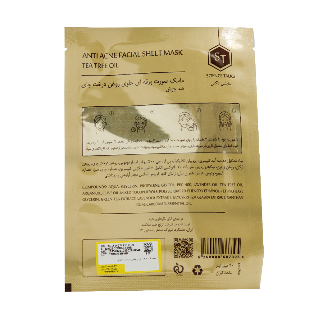 ماسک صورت ورقه ای ضد جوش روغن درخت چای ساینس تاکس 20 میلی لیتر