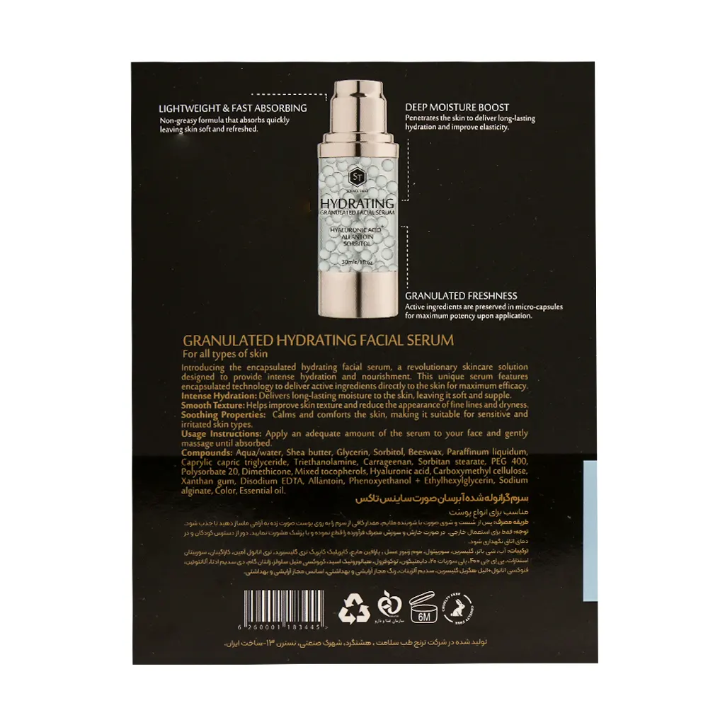 سرم گرانوله شده آبرسان صورت ساینس تاکس یک سرم تخصصی و مدرن برای آبرسانی عمیق، افزایش شادابی و بهبود بافت پوست بوده که با تکنولوژی گرانولاسیون فرموله شده است. این تکنولوژی باعث میشود مولکولهای هیالورونیک اسید در ساختاری پایدارتر قرار گیرند و هنگام تماس با پوست فعال شوند، بنابراین آبرسانی قدرتمند و تدریجی ایجاد میشود.