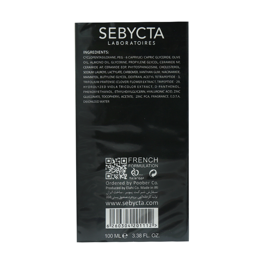 سیکلوپنتاسیلوکسان، پی ای جی-6 کاپریلیک/کاپریک گلیسیرید، روغن زیتون، روغن بادام، گلیسیرین، پروپیلن گلیکول، سرامید ان پی، سرامید ای پی، سرامید ای او پی،فیتوسفینگوسین، کلسترول، سدیم لوریل لاکتیلات، کربومر، زانتان گام، نیاسینامید، مانیتول، بوتیلن گلایکول، دکستران، استیل تترا پپتاید-3 عصاره گل تریفولیوم پرتنس (کلاور)، تری پپتاید-29، عصاره هیدرولیز شده ویولا تری کالر، دی پنتنول، فنوکسی اتانل، اتیل هگزیل گلیسیرین، هیالورونیک اسید، زینک گلوکونات، توکوفریل استات، زینک پی سی ای، اسانس مجاز آرایشی و بهداشتی، ا د ت آ، آب دیونیزه