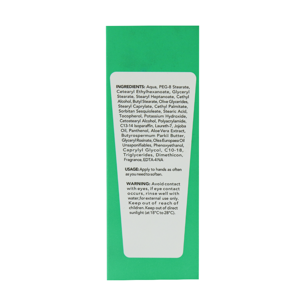 آب دیونیزه، PEG-8 استئارات، ستئاریل اتیل هگزانوات، گلیسریل استئارات، ستئاریل هپتانات، ستئیل الکل، بوتیل استئارات، گلیسریدهای زیتون، استئاریل کاپریلات، ستئیل پالمیتات، سوربیتان سسکی اولئات، اسید استئاریک، توکوفرول، هیدروکسید پتاسیم، ستوستئاریل الکل، پلی آکریل آمید، C13-14 ایزوپارافین، لورث-7، روغن جوجوبا، پانتنول، عصاره آلوئه ورا، کره شیا، گلیسریل روزینات، روغن زیتون غیر قابل صابونی شدن، فنوکسی اتانول، کاپریلیل گلیکول، تری گلیسریدهای C10-18، دایمتیکون، عطر، EDTA-4NA