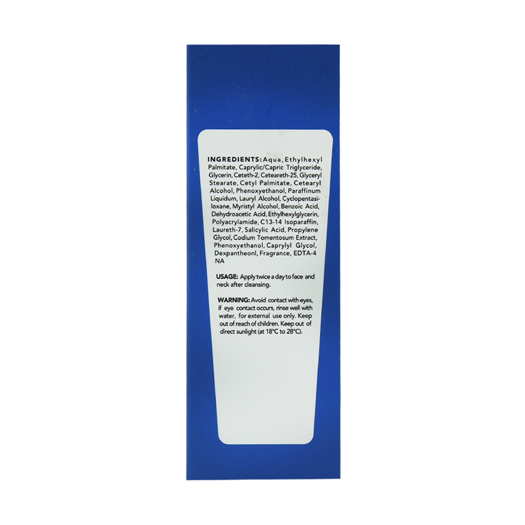 آب، اتیل هگزیل پالمیتات، کاپریلیک/کاپریک تری گلیسرید، گلیسرین، ستث-2، ستئارت-25، گلیسیریل استئارات، ستیل پالمیتات، ستیل الکل، فنوکسی اتانول، پارافین مایع، لوریل الکل، سیکلوپنتاسیلوکسان، میریستیل الکل، اسید بنزوئیک، اسید دهیدرو استیک، اتیل هگزیل گلیسیرین، پلی آکریل آمید، C13-14، ایزو پارافین، لورت-7، اسید سالیسیلیک، پروپیلن گلایکول، عصاره کودیوم تومنتوسوم، فنوکسی اتانول، کاپریلیل گلایکول، دکسپانتنول، عطر، EDTA-4NA.