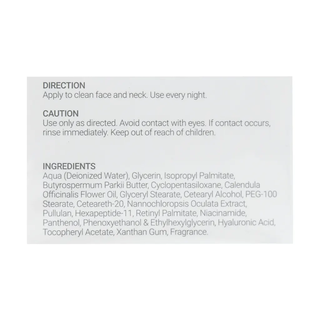 آب، گلیسرین، ایزوپروپیل پالمیتات، کره شی باتر، سیکلوپنتاسیلوکسان، عصاره کالاندولا، گلیسرین استئارات، ستئاریل الکل، PEG-100 استئارات، ستئارت-20، عصاره نانوکلروپسیس، پولولان، هگزاپپتید-11، رتینیل پالمیتات، نیاسینامید، پنتنول، فنوکسی اتانول، اتیل هگزیل گلیسرین، هیالورونیک اسید، توکوفریل استات، زانتان گام، رایحه
