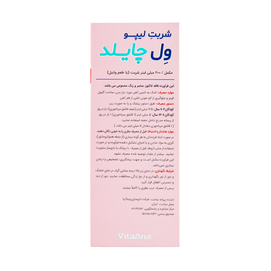 شربت لیپو ول چایلد ویتا آریا یک مکمل غذایی ویژه برای کودکان است که به طور خاص برای تقویت سلامت عمومی و جلوگیری از کم خونی طراحی شده است. این شربت با طعم دلپذیر و فرمولاسیون مناسب، مصرف آن را برای کودکان آسان و لذت بخش میکند. در ادامه جهت بررسی بیشتر، توضیحاتی درباره ترکیبات موجود در آن آوردهایم: