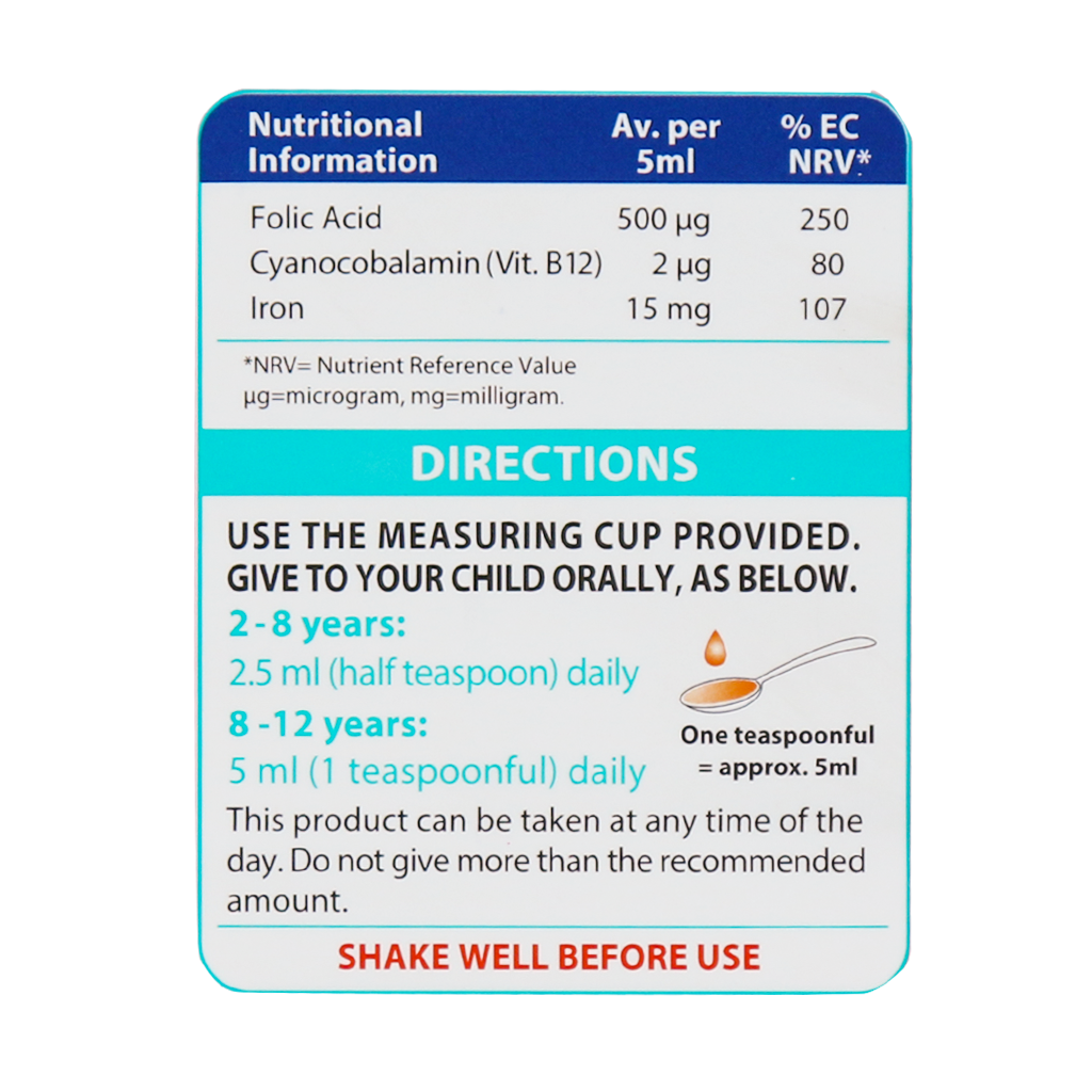 - فولیک اسید: ویتامین B9 از جمله ترکیبات ضروری موجود در شربت آهن کودکان است و به در دوران رشد سریع کودکان و تقویت سیستم ایمنی بسیار اهمیت دارد.